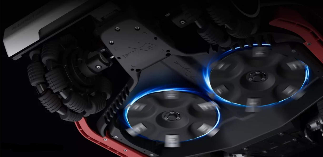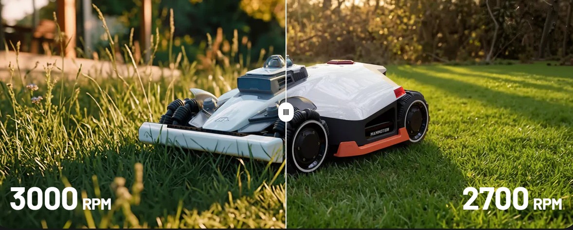 Deux moteurs haute puissance de 165 W à 6 lames travaillent avec la vision IA du robot tondeuse intelligent LUBA 3 AWD pour ajuster automatiquement vitesse et puissance selon la densité de l’herbe, optimisant ainsi la coupe et l’efficacité énergétique.